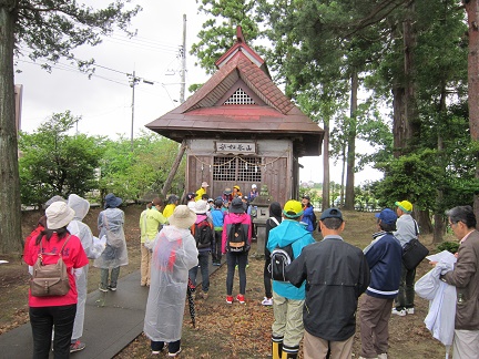 自作のパンフレットを見ながら、地区の史跡やお寺、神社等を巡り、約6キロの道のりを歩きました。(諏訪地区の西部、南部)