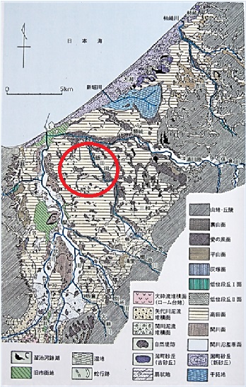 自然堤防の分布からは、高田平野頭部は保倉川、飯田川、桑曽根川、櫛池川、重川、戸野目川、関川が縦横無尽に乱流していたことが分かる。