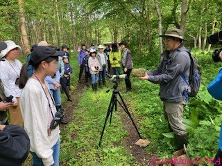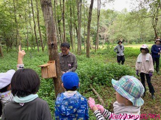巣箱をのぞくとシジュウカラのヒナや卵を発見!バードコールで鳥を呼んだり、鮮やかなキビタキを観察したり、早朝の森の魅力を五感で味わいました。